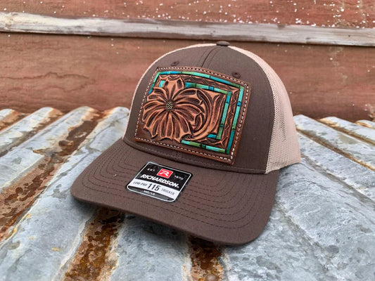 The Rodeo Rose Daisy Handtooled Leather Patch Cap with Turquoise Southwestern Border