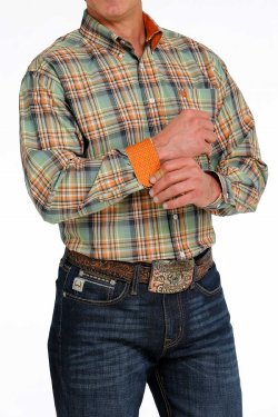 MEN'S CINCH PLAID BUTTON-DOWN WESTERN SHIRT - GREEN / ORANGE