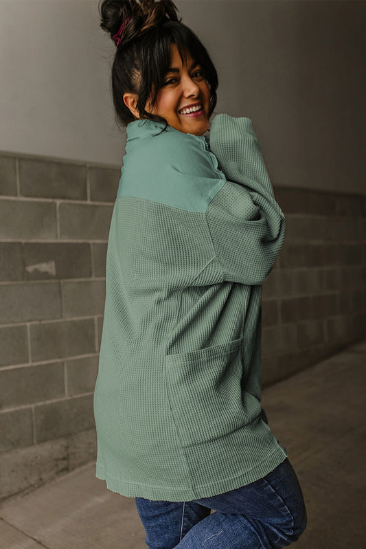Women' s Waffle Long Sleeve Collar Half Button Loose Top