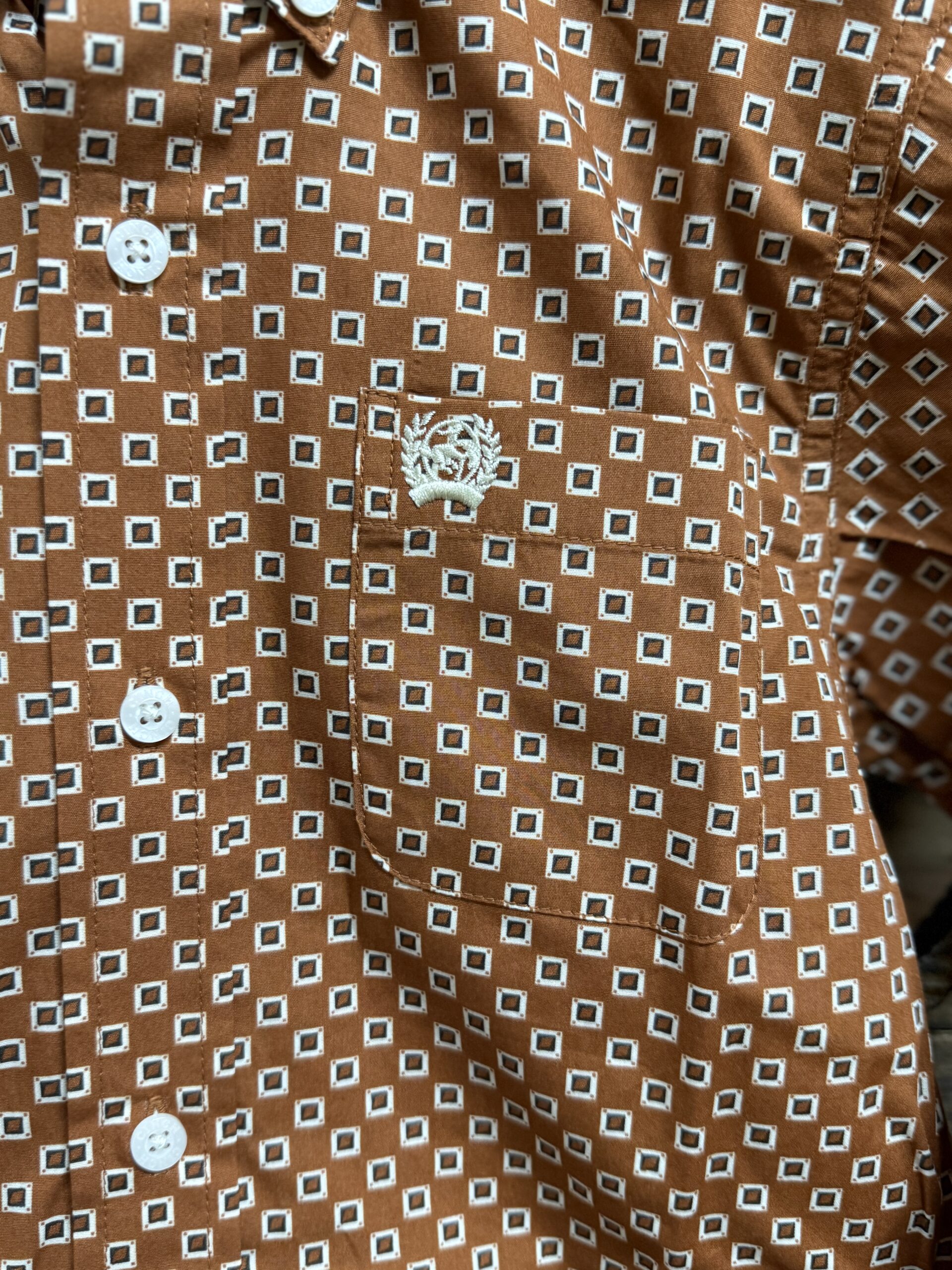 Be like dad! Classic long sleeve button down for boys in the same print and design for dad. Pretty brown base with a white square print. Classic white buttons line the front, pin down the collar, and adjust the sleeve on a 2-button set. The open front pocket displays the Cinch logo in cream embroidery. A look that is ideal for the classroom, family pics, special occasions, the show ring, etc. We could go on and on. It literally a look for any event!