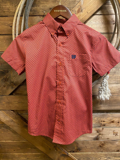 Classic Western style gets a bold update in the Cinch Boy’s Red Geo Print Western Shirt. Designed with an allover micro geometric pattern and finished in a vibrant red hue, this short sleeve shirt is perfect for warmer days. A button-down collar, single chest pocket with embroidered Cinch logo, and full button front create a polished look that’s just right for everything from school days to rodeo nights.