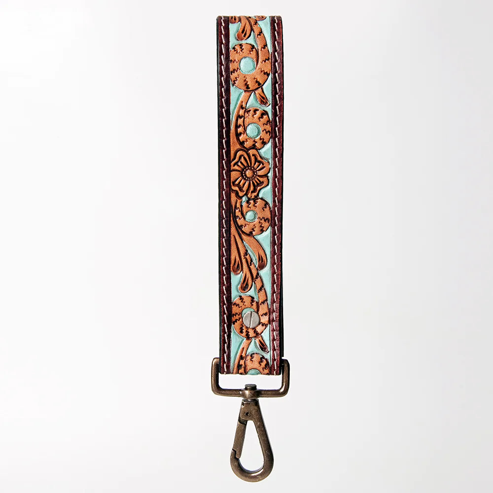 Made with an enticing combination of hand-tooled vegetable tanned cowhide leather  stainless steel snap hooks are used because these are durable and easy to use. Tooled and painted leather. 1.25"15"