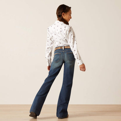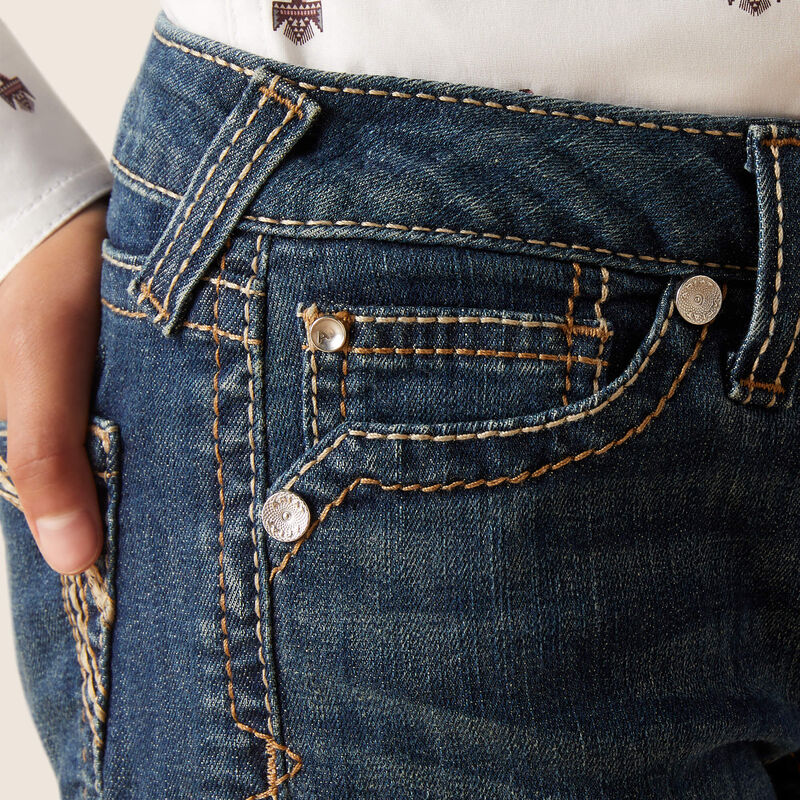 Overview Dressed up to rodeo or dusted off for school, this versatile trouser goes everywhere, does anything. We finished it off with subtle pocket stitching she can wear with anything. Features Five pocket styling Size & Fit Slim fitting through thigh Boot cut with trouser styling Materials 9.75 oz ring-spun denim 93% Cotton, 5% Polyester, 2% Lycra® Spandex Elastane