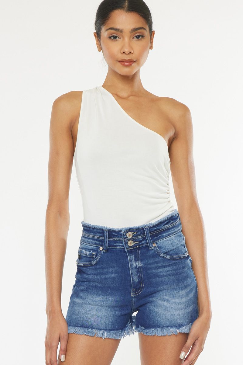 HIGH RISE DENIM SHORTS SHORT JEAN DENIM DOUBLE WAIST BAND MEDIUM STONE WASH 2 BUTTON ZIP FLY FRAYED HEM 10.75" RISE , 3" INSEAM IN SIZE M 94.9% COTTON , 3.8% POLYESTER , 1.3% SPANDEX