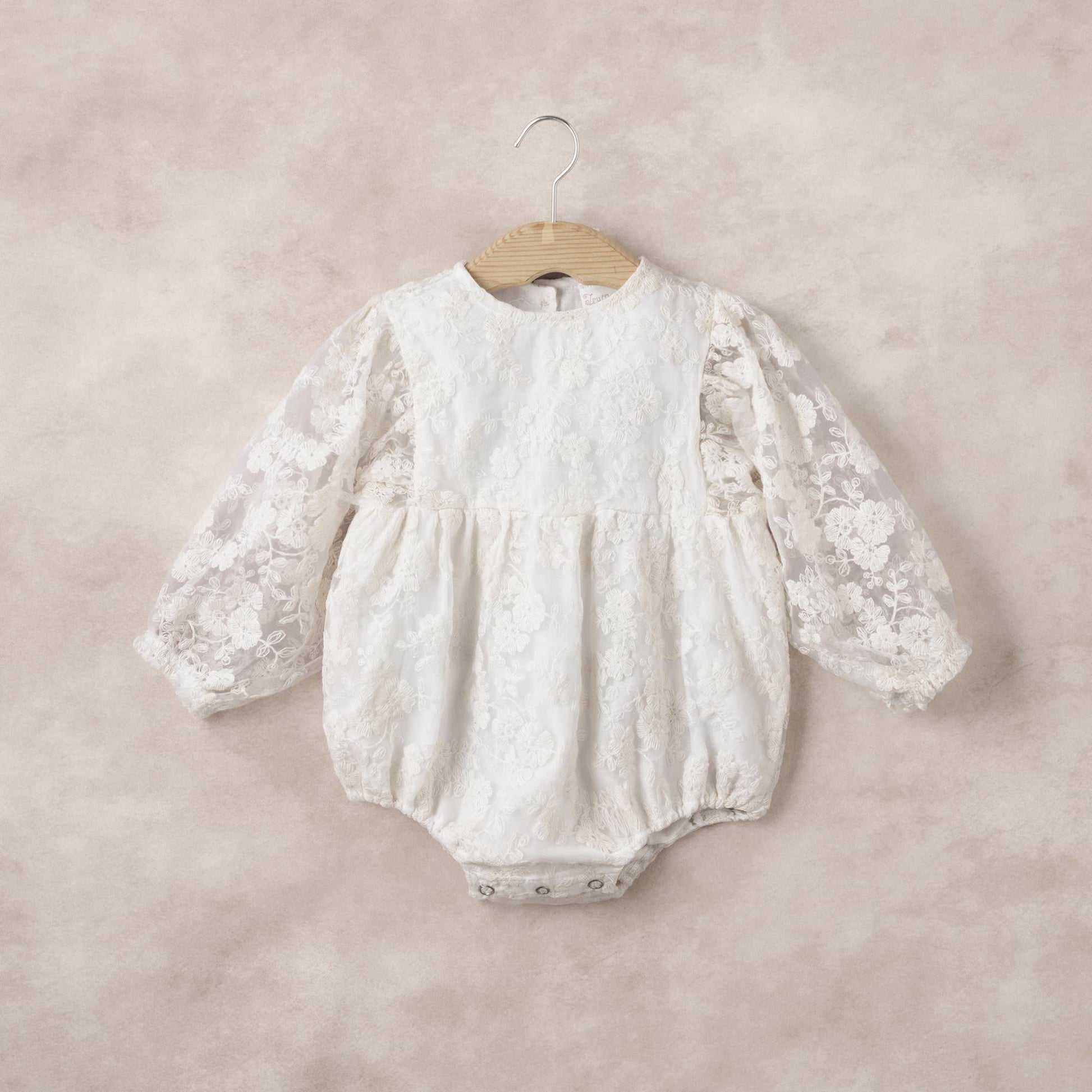This elegant baby romper features a sheer embroidered organza overlay in soft ivory, creating a timeless silhouette perfect for special occasions. Designed with long sleeves and elastic cuffs for comfort and charm, it fastens with back buttons and snaps underneath for easy changes.