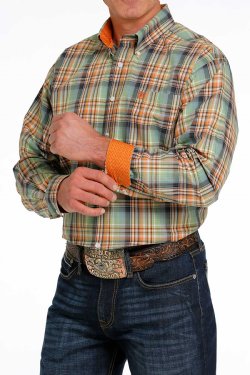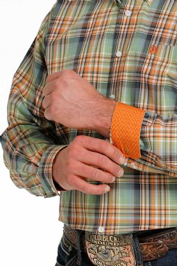 Built to perform any day of the week, this head-turning green plaid cotton plain weave features a trendy orange contrast trim, open left front pocket with embroidered logo and white buttons. Accent any blue jeans in the stack with this all-season shirt that helps define your unique style.
