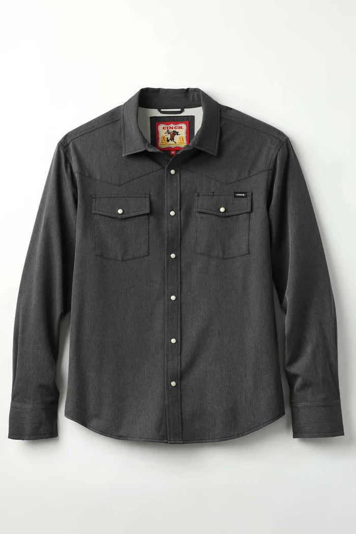 Engineered for rider performance with a classic Western edge, this black lightweight poly-spandex stretch twill weave camp shirt delivers comfort and mobility in the saddle or out on the trail. Featuring a back yoke vent, double front pockets, CINCH logo embroidery, and cream marble snaps, it transitions effortlessly from ranch life to after-hours events.