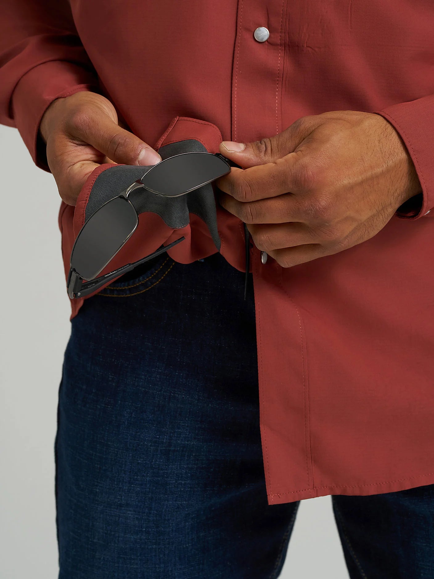 Take on the unexpected in one of our most dependable shirts. The Wrangler® performance long-sleeve solid snap shirt comes with everything you need to take on the day, including UV protection from the sun’s harmful rays and a moisture-wicking finish to keep you feeling dry. This classic fit shirt is crafted for unparalleled performance and comfort, complete with a back vent for breathability. It also features that classic western styling you know and love, including pointed yokes and a full snap closure. You’ll have plenty of space for your essentials between the double chest pockets, a Napoleon-style pocket on the left chest pocket, a dedicated pencil slot, and a glasses cleaner at the hem. Wear this performance snap shirt with your favorite pair of Wrangler jeans or utility pants for a formidable outfit.